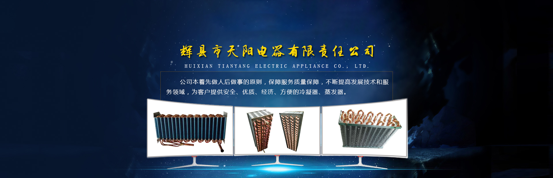 輝縣天陽(yáng)電器有限責(zé)任公司位于肥沃的中原河南省輝縣市學(xué)院路中段工業(yè)集聚區(qū)興業(yè)園3號(hào)廠房,以制冷設(shè)備用冷凝器,蒸發(fā)器,熱交換器為主。主要材料為銅管鋁翅片,銅管銅翅片,鋁管鋁翅片。廣泛應(yīng)用于冰箱冰柜,制冷設(shè)備,暖通設(shè)備,空調(diào),自動(dòng)售貨機(jī),冷干機(jī),超市立風(fēng)柜,冷藏車,烘干機(jī)等產(chǎn)品領(lǐng)域?! 」咀?998年成立以來(lái),始終堅(jiān)持:“科技造就產(chǎn)業(yè)、質(zhì)量成就信譽(yù)、誠(chéng)信鑄就輝煌”的質(zhì)量方針,從產(chǎn)品拓展上堅(jiān)持“人無(wú)我有,人有我優(yōu),人優(yōu)我特的”經(jīng)營(yíng)理念,25年來(lái),從1998年開(kāi)始供應(yīng)河南冰熊集團(tuán)下屬的冷柜廠,制冰機(jī)廠各種冷凝器;2003年之后,原冰熊集團(tuán)的精英志士開(kāi)始在全國(guó)各地發(fā)展,所到之處依托我公司供貨,以致于多家目前已具行業(yè)中佼佼者的公司,從而建立了如凱雪公司,兆邦公司、凌云公司、海寶公司、正雪公司、上海忠云、山東德萊維等幾十余家公司在草創(chuàng)時(shí)期的啟蒙供貨商,友好共贏長(zhǎng)達(dá)十余年,成為我國(guó)制冷行業(yè)的供應(yīng)商。以致在2015年初雙匯集團(tuán)面向社會(huì)的招標(biāo)書(shū)中指名要我公司冷凝器、蒸發(fā)器指定產(chǎn)品供應(yīng)商